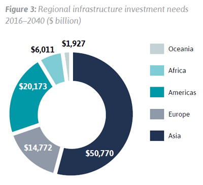 - Châu Á là nơi có nhu cầu cơ sở hạ tầng lớn nhất thế giới, ở mức 52 nghìn tỷ đô la Mỹ cho tới năm 2040.