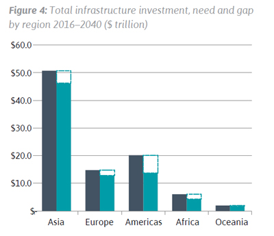 Mỗi năm sẽ cần đến khoảng 3,7 nghìn tỷ đô la Mỹ đầu tư vào cơ sở hạ tầng nhằm đáp ứng nhu cầu ngày càng gia tăng của dân số toàn cầu, tương đương với tổng giá trị GDP hàng năm của Đức – nền kinh tế lớn thứ tư trên thế giới. Và để đạt được các mục tiêu phát triển bền vững của LHQ về tiếp cận nước sạch và điện năng, mức đầu tư dự kiến phải tăng thêm 236 tỷ đô la mỗi năm cho tới năm 2030 – thời hạn hoàn thành các mục tiêu này.