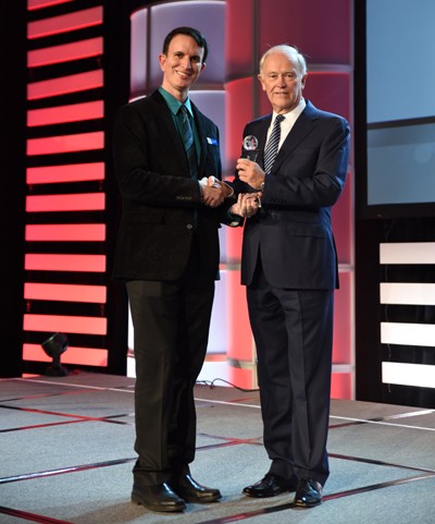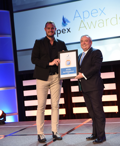 Ông Patrick Brannelly – Phó chủ tịch phụ trách Trải nghiệm khách hàng (Giải trí trên máy bay & Khả năng kết nối) của Emirates nhận giải Dịch vụ Giải trí Tốt nhất do Khách hàng bình chọn tại APEX Passenger Choice Awards năm 2017