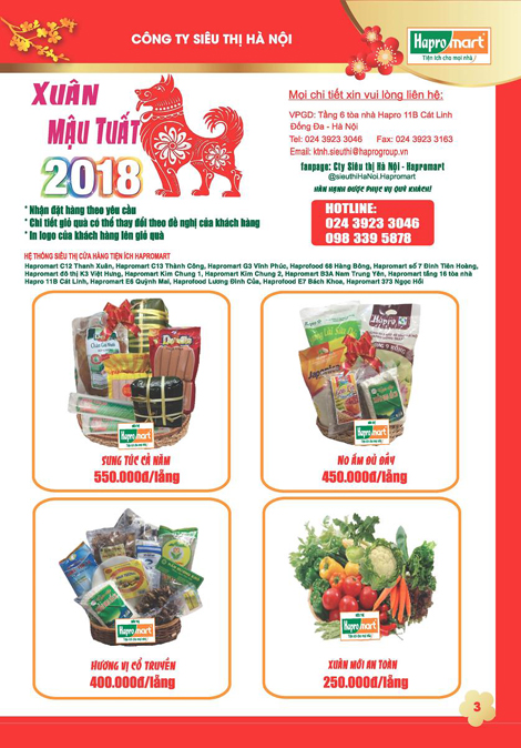 Nhân dịp Tết Nguyên Đán Mậu Tuất 2018, Tổng công ty Thương mại Hà Nội (Hapro) đã tích cực chuẩn bị hàng hóa nhằm mang tới khách hàng nhiều chương trình mua sắm với ưu đãi đặc biệt về giá, phong phú, hấp dẫn về chủng loại mặt hàng và chất lượng đảm bảo. Chương trình kinh doanh Tết được Hapro triển khai tới người tiêu dùng Thủ đô từ ngày 11/01/2018 đến ngày 03/03/2018 (tức 25/11/2017 – 16/01/2018 âm lịch).
