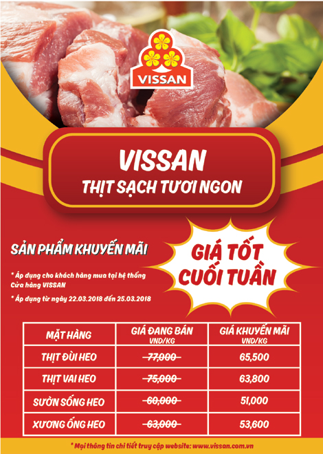 Theo đó, từ ngày 22/03/2018 – 25/03/2018, công ty VISSAN giảm giá 15% đối với các mặt hàng thịt heo tươi sống: Thịt đùi heo, Sườn sống heo, Xương ống heo, Thịt vai heo.