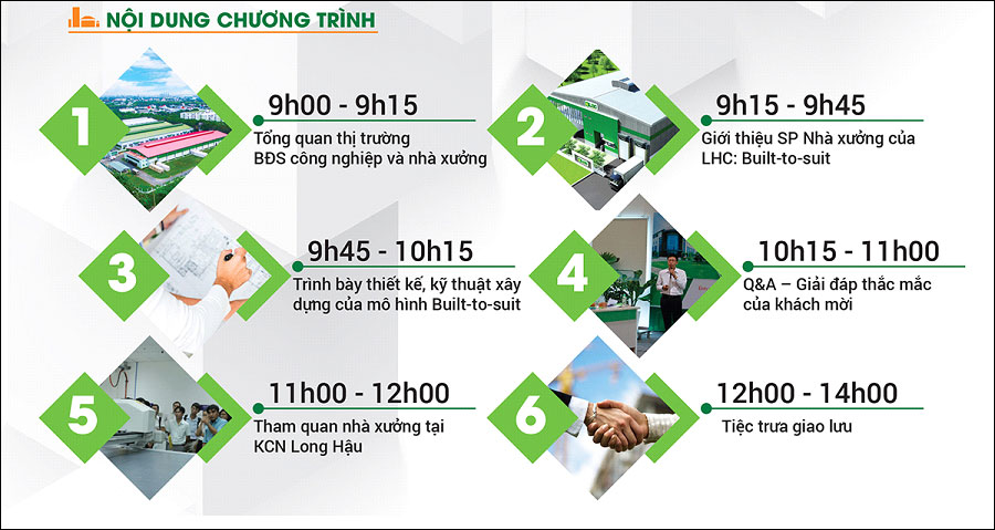 Nhằm giúp các đơn vị, đối tác hiểu rõ hơn về nhà xưởng xây theo yêu cầu (Built-to-suit), Công ty Cổ phần Long Hậu (LHC) sẽ tổ chức buổi hội thảo giới thiệu chuyên sâu về mô hình với thông điệp “Built-to-suit - Build your success”. Thông qua sự kiện, các khách mời sẽ có cơ hội hiểu rõ hơn về những lợi ích của nhà xưởng xây theo yêu cầu và cùng giao lưu, chia sẻ kinh nghiệm trong thị trường bất động sản công nghiệp.