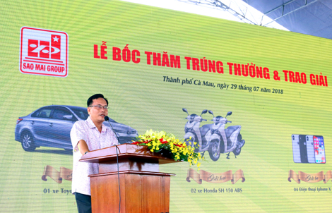 Ông Trần Ngọc Thơ – Phó Giám đốc Ban Quản lý Dự án Đầu tư & Xây dựng TP Cà Mau phát biểu tại buổi Lễ bốc thăm trúng thưởng tại ĐTM Nhựt Hồng