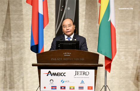 Thủ tướng Nguyễn Xuân Phúc phát biểu tại Diễn đàn đầu tư Mekong-Nhật Bản. Ảnh: VGP/Quang Hiếu