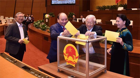 Tổng Bí thư Nguyễn Phú Trọng, Thủ tướng Nguyễn Xuân Phúc, Chủ tịch Quốc hội Nguyễn Thị Kim Ngân, Thường trực Ban Bí thư Trần Quốc Vượng bỏ phiếu bầu Chủ tịch nước. Ảnh: Minh Thăng
