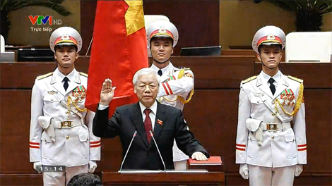 Tiếp đó, Tân Chủ tịch nước Nguyễn Phú Trọng thực hiện nghi thức tuyên thệ nhậm chức. Ông nói: Trước cờ đỏ thiêng liêng của Tổ quốc, trước Quốc hội, đồng bào và cử tri cả nước, tôi, Nguyễn Phú Trọng, Chủ tịch nước Cộng hòa xã hội chủ nghĩa Việt Nam Việt Nam, xin tuyên thệ: Tuyệt đối trung thành với Tổ quốc, với nhân dân, với Hiến pháp nước Cộng hòa xã hội chủ nghĩa Việt Nam, nỗ lực làm hết sức mình, hoàn thành tốt nhiệm vụ mà Đảng, Nhà nước và nhân dân giao phó.