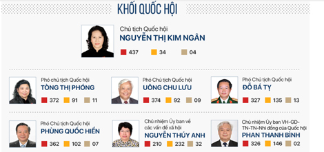 Chiều 25/10, Quốc hội công bố kết quả lấy phiếu tín nhiệm 48 chức danh theo thứ tự các khối: Chủ tịch nước; Quốc hội; Chính phủ; Toà án nhân dân tối cao, Viện Kiểm sát nhân dân tối cao và Kiểm toán Nhà nước.