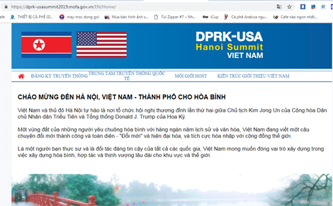 Trang chủ của trang web thượng đỉnh Mỹ-Triều đăng lời chào mừng đến với Hà Nội – “Thành phố của hòa bình”. “Việt Nam và thủ đô Hà Nội tự hào khi được tổ chức thượng đỉnh lần hai giữa Chủ tịch CHDCND Triều Tiên Kim Jong-un và Tổng thống Mỹ Donald Trump”, trích từ đoạn giới thiệu bằng tiếng Anh trên trang web.