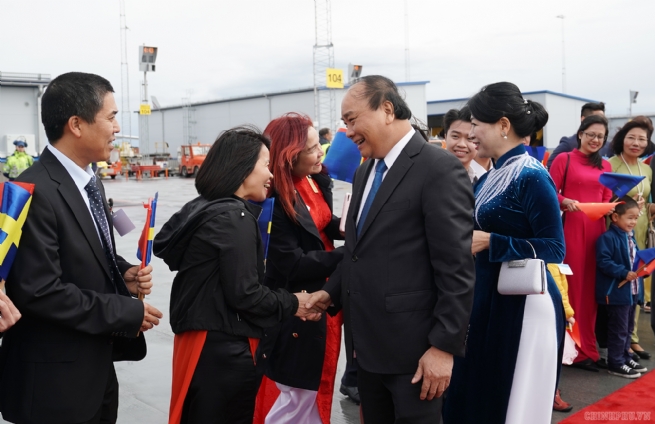 Đón Thủ tướng, Phu nhân và đoàn tại sân bay có Bộ trưởng Thương mại và Các vấn đề Bắc Âu Ann Linde, đại diện Bộ Ngoại giao, Đại sứ Thuỵ Điển tại Việt Nam Pereric Hogberg; về phía Việt Nam có Đại sứ Việt Nam tại Thuỵ Điển Đoàn Thị Phương Dung, cán bộ, nhân viên Đại sứ quán và cộng đồng người Việt Nam tại Thuỵ Điển.