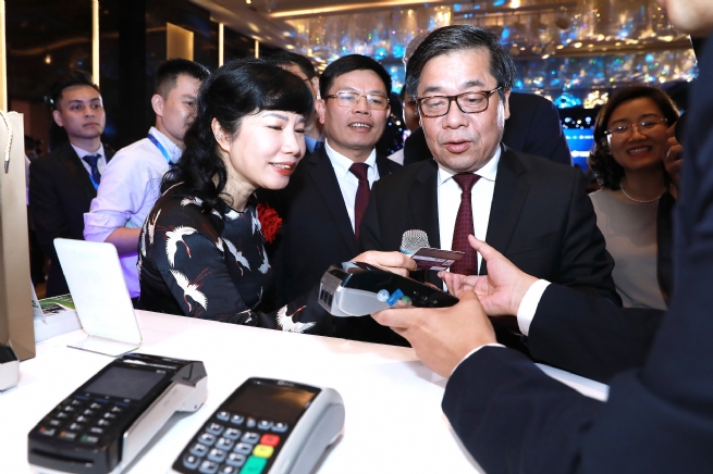 Lãnh đạo NHNN và đại diện các đơn vị trải nghiệm dịch vụ thanh toán hiện đại. Ảnh: VGP/Huy Thắng.