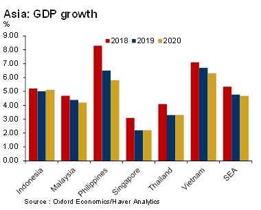 Trên toàn khu vực, tăng trưởng dự kiến sẽ chậm lại ở mức 4,8% trong năm nay từ mức 5,3% trong năm 2018, do tăng trưởng xuất khẩu đang trong tình trạng ảm, sự gia tăng bảo hộ thương mại và nhu cầu nhập khẩu của Trung Quốc suy yếu.