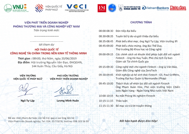 Phòng Thương mại và Công nghiệp Việt Nam phối hợp với Viện Quốc tế Pháp Ngữ (IFI) cùng với trường Đại học Quản trị Normandie (Cộng hòa Pháp) tổ chức Hội thảo quốc tế “CÔNG NGHỆ TÀI CHÍNH TRONG NỀN KINH TẾ THÔNG MINH” nhằm nhận diện những thách thức và cơ hội đối với lĩnh vực tài chính trong thời đại chuyển đổi số liên quan tới mọi mặt của đời sống, kinh tế – xã hội: khuôn khổ pháp lý; bảo mật và an toàn thông tin; những đòi hỏi về công nghệ, tổ chức kinh doanh các dịch vụ tài chính, cũng như những vấn đề đặt ra đối với người tiêu dùng, v.v.