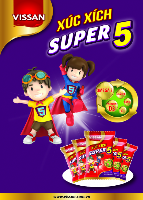 Lần đầu tiên, công ty VISSAN kết hợp năm dưỡng chất quan trọng Canxi, Kẽm, Vitamin D3, Omega 3 và Chất xơ trong một sản phẩm mang tên Xúc xích Super 5. Sản phẩm mang đến một lựa chọn dinh dưỡng mới, tốt cho sức khỏe của người tiêu dùng, đặc biệt là trẻ em.