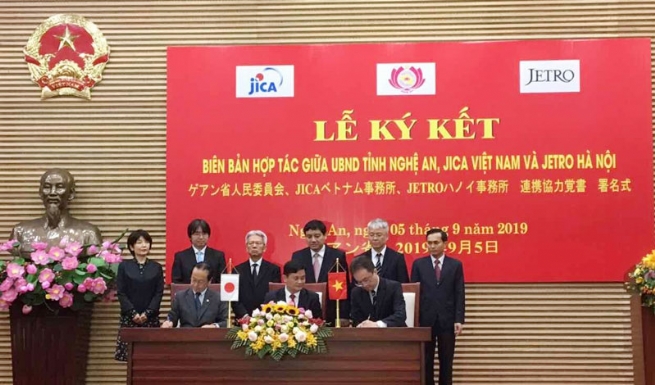 Ngày 5/9/2019, Bản Ghi nhớ Hợp tác (MOC) nhằm tăng cường hợp tác chiến lược và toàn diện để phát triển tỉnh Nghệ An đã được ký kết giữa Ủy ban Nhân dân (UBND) tỉnh Nghệ An, Văn phòng JICA Việt Nam và Văn phòng JETRO Hà Nội.