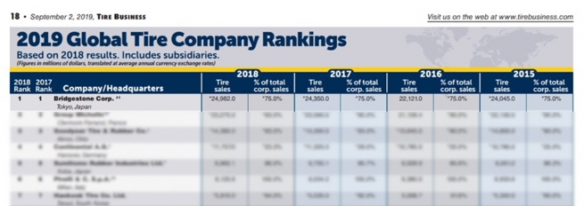Căn cứ theo Bảng xếp hạng Lốp toàn cầu năm của năm 2019, dựa trên kết quả của năm 2018, doanh số bán lốp của Tập đoàn Bridgestone trên toàn cầu ước tính đạt gần 25 tỷ đô la Mỹ. Để mang đến sự so sánh và xếp hạng công bằng, tiêu chí duy nhất Tire Business đánh giá các nhà sản xuất lốp xe là dựa trên doanh thu từ việc bán lốp xe mà họ đã sản xuất, không bao gồm doanh thu từ các mặt hàng khác như dây thép, cao su tổng hợp hoặc muội than,… hay doanh thu liên quan đến các dịch vụ tự động tại các cửa hàng bán lẻ thuộc sở hữu của các công ty.