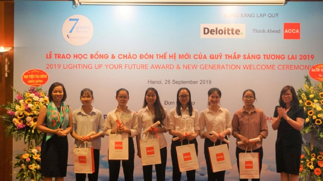 Năm 2019, 84 sinh viên xuất sắc nhất đã nhận được Học bổng “Thắp sáng tương lai” với tổng trị giá 2,1 tỷ đồng. Mỗi suất học bổng được trao trị giá 25 triệu đồng với giá trị thực tế khác biệt bao gồm: Học bổng bằng kinh nghiệm nghề nghiệpquý báu với các kỳ thực tập, các khóa đào tạo kỹ năng mềm tại các doanh nghiệp kiểm toán và tư vấn uy tín trong đó có Deloitte Việt Nam; Học bổng về tinh thần với các chương trình Coaching, Mentoring với sự dìu dắt, chia sẻ của các Anh/Chị có uy tín trong nghề và Học bổng bằng tiền mặt (10 triệu đồng) để giúp các em trang trải học phí tại trường cũng như các khóa học tùy sinh viên nhận học bổng lựa chọn. Sinh viên nhận học bổng sẽ được miên phi đăng ky đầu vào và theo học môn Kế toán tài chinh (F3 – Financial Accounting) của chương trình nghề nghiệp quôc tế ACCA.