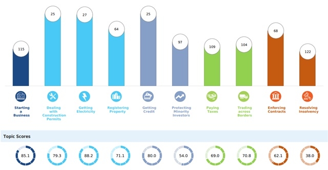 Điểm số và vị trí xếp hạng của của Việt Nam với 10 tiêu chí: Thành lập doanh nghiệp, Xin giấy phép xây dựng, Tiếp cận điện năng, Đăng ký tài sản, Vay vốn, Bảo vệ lợi ích nhà đầu tư thiểu số, Nộp thuế, Giao thương quốc tế, Thực thi hợp đồng và Xử lý khi mất khả năng thanh toán