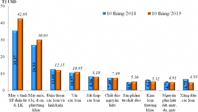 10 ngành hàng có giá trị nhập khẩu cao nhất trong 10 tháng qua bao gồm máy vi tính và sản phẩm điện tử, máy móc thiết bị, điện thoại các loại và linh kiện, vải, sắt thép, chất dẻo, sản phẩm từ chất dẻo, kim loại thường, nguyên phụ liệu dệt may và xăng dầu.