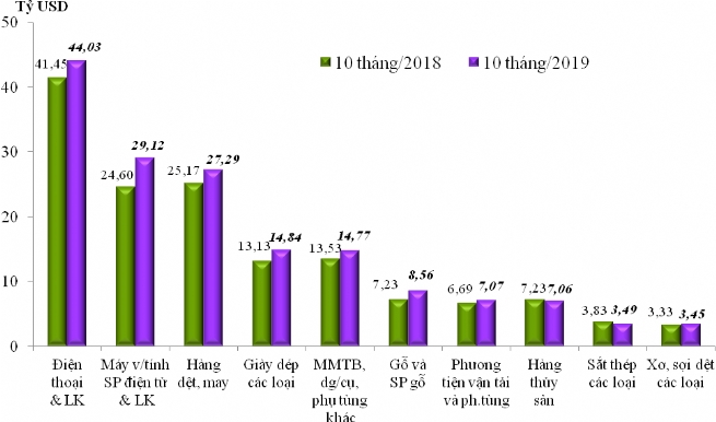 10 nhóm hàng xuất khẩu lớn nhất của Việt Nam trong 10 tháng qua là điện thoại, mát vi tính, hàng dệt may, giày dép, máy móc thiết bị, gỗ, phương tiện vận tải, hàng thuỷ sản, sắt thép và xơ sợi dệt các loại.