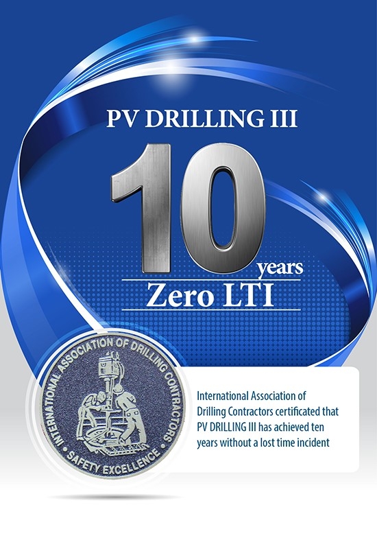 Tính đến ngày 12/11/2019, giàn khoan tự nâng PV DRILLING III chính thức đạt thành tích 10 năm liên tục vận hành an toàn không để xảy ra sự cố gây mất thời gian lao động (Zero Lost Time Incident) được công nhận bởi Hiệp hội các Nhà thầu khoan Dầu khí Quốc tế (International Association of Drilling Contractors).