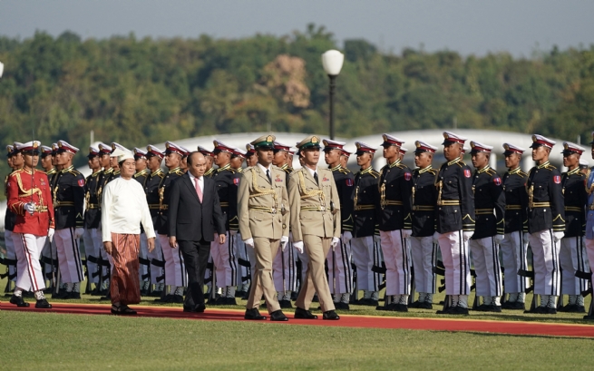 Sau đó, Thủ tướng Nguyễn Xuân Phúc và Tổng thống Win Myint duyệt đội danh dự. Tiếp đến, hai nhà lãnh đạo giới thiệu các thành viên đoàn cấp cao Việt Nam và Myanmar.