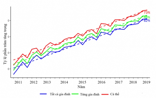 Biểu đồ tỷ lệ phần trăm tăng trọng tôm bố mẹ chọn giống tại Việt - Úc
