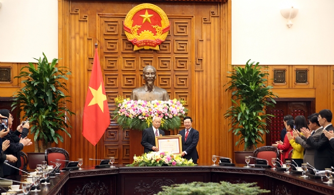 Phó Thủ tướng Phạm Bình Minh trao Huân chương Hữu nghị cho ông Hoàng Quần, nguyên Cục trưởng Cục 2 Ban Liên lạc đối ngoại Trung ương Đảng Cộng sản Trung Quốc. Ảnh: VGP/Hải Minh