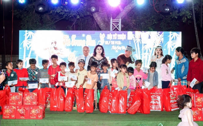 Vợ chồng doanh nhân Lâm Thị Liễu tặng quà cho trẻ em nghèo hiếu học tại xã Kông Bla, Huyện K’Bang