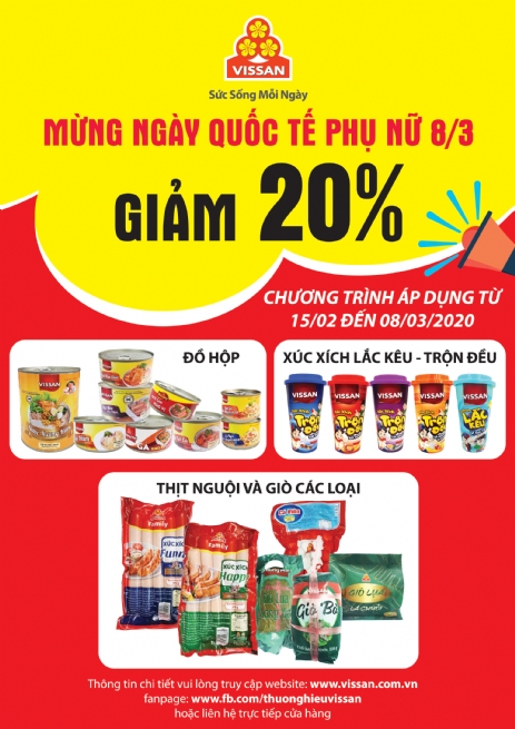 Nhằm chào mừng ngày quốc tế phụ nữ 08/03 đồng thời tri ân khách hàng đã luôn đồng hành cùng VISSAN trong thời gian qua, công ty VISSAN triển khai chương trình khuyến mãi “Mừng Ngày Quốc Tế Phụ Nữ 08/03 - Tưng Bừng Khuyến Mãi Giảm Giá 20% Thực Phẩm Chế Biến”.