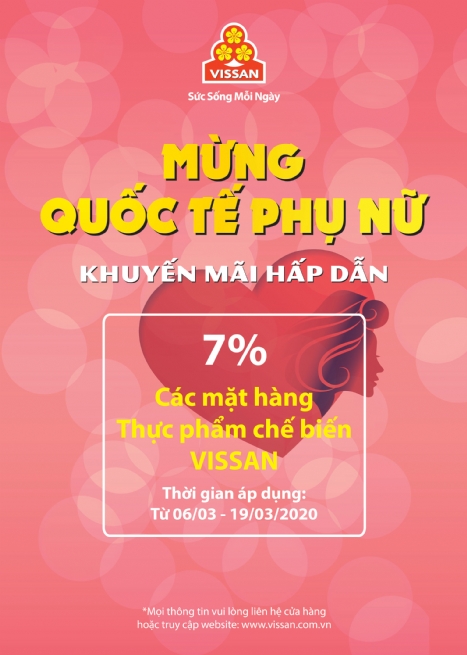 Nhằm chào mừng ngày quốc tế phụ nữ 08/03 đồng thời tri ân khách hàng đã luôn đồng hành cùng VISSAN trong thời gian qua, công ty VISSAN triển khai chương trình khuyến mãi giảm giá 07% thực phẩm chế biến.