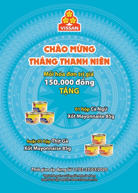 Song song với chương trình khuyến mãi chào mừng ngày quốc tế phụ nữ 08/03, từ ngày 11/03/2020 đến ngày 27/03/2020 công ty VISSAN cũng triển khai chương trình ưu đãi chào mừng Tháng Thanh Niên cho quý khách hàng khi mua sắm tại hệ thống cửa hàng VISSAN. Theo đó, với mỗi hóa đơn trị giá 150.000 đồng sẽ được tặng 1 hộp Cá ngừ xốt dầu Mayonnaise 85g hoặc 1 hộp Thịt gà xốt Mayonnaise 85g.
