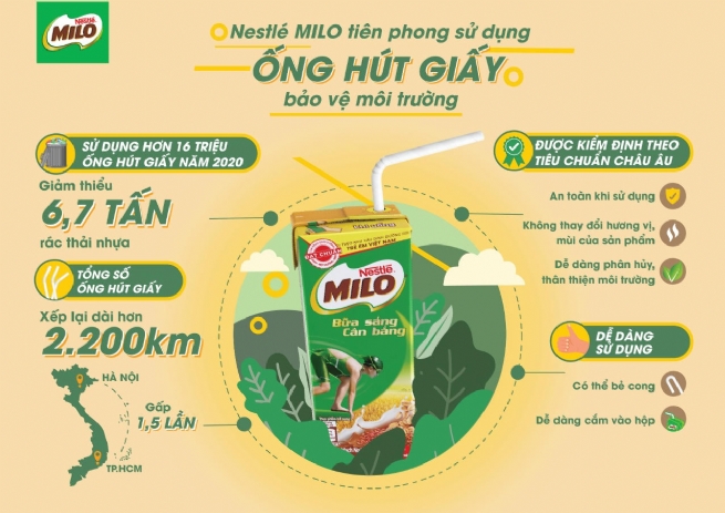 Từ tháng 3/2020, nhãn hàng Nestlé MILO thuộc công ty Nestlé Việt sẽ chính thức sử dụng ống hút giấy cho dòng sản phẩm MILO Bữa sáng thay cho ống hút nhựa thông thường. Đây cũng là lần đầu tiên tại Việt Nam, các sản phẩm của Nestlé MILO áp dụng sáng kiến này.