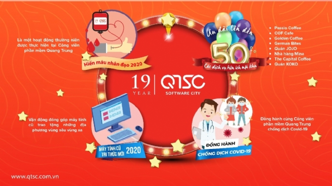 Đúng ngày kỷ niệm 19 năm thành lập Công viên phần mềm Quang Trung (16/03/2020) QTSC bắt đầu triển khai chương trình tặng 2500 chai nước rửa tay cho toàn bộ các doanh nghiệp đang hoạt động tại đây. Bên cạnh đó, QTSC còn tổ chức thêm nhiều hoạt động cộng đồng khác như: tháng khuyến mãi - ưu đãi lên đến 50% cho các dịch vụ tiện ích nội khu áp dụng trong cả tháng 3, chương trình hiến máu nhân đạo mới được tổ chức ngày 04/03/2020 với hơn 120 người hiến máu tình nguyện, chương trình Máy tính cũ – Tri thức mới vận động góp máy tính cũ trao tặng những địa phương vùng sâu, vùng xa.