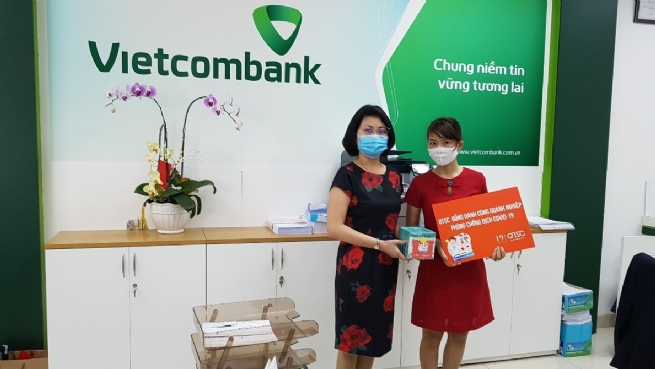 Đại diện QTSC tặng nước rửa tay cho phòng giao dịch Vietcombank tại QTSC