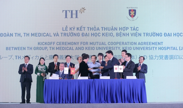 Chủ tịch Tập đoàn TH và lãnh đạo Trường ĐH Keio, Bệnh viện Trường ĐH Keio (Nhật Bản) ký thỏa thuận hợp tác, tại lễ động thổ TH Medical - Ảnh: VIỆT DŨNG