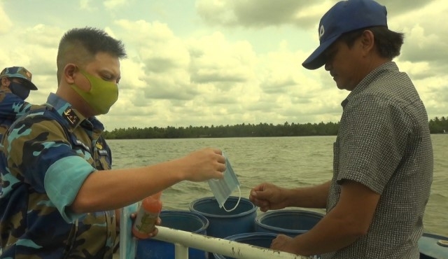 Ngoài chương trình cấp nước cho nhân dân vùng hạn mặn, Chỉ huy Tàu 937 đã phối hợp với chính quyền địa phương tổ chức tuyên truyền phòng, chống dịch Covid-19 trên hệ thống truyền thanh của tàu và hướng dẫn cách sát khuẩn phòng dịch, phát khẩu trang cho nhân dân đến nhận nước ngọt sinh hoạt.