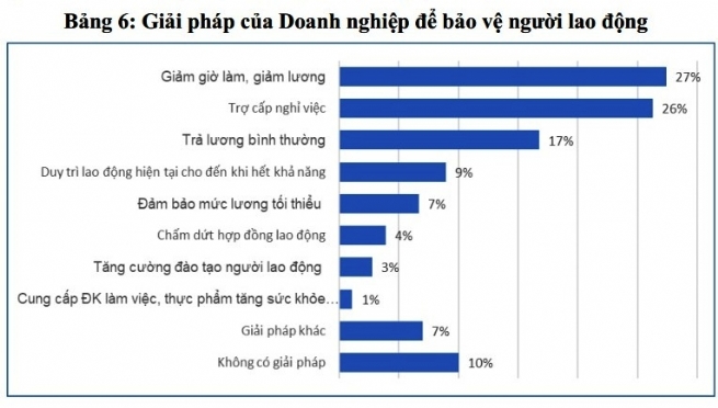 Chỉ có 4% số doanh nghiệp trả lời áp dụng biện pháp chấm dứt hợp đồng lao động và 10% không có giải pháp còn 27% doanh nghiệp trả lời lựa chọn giải pháp giảm giờ làm, giảm lương nhưng vẫn duy trì số lượng lao động để cùng người lao động chung sức vượt qua thời gian khó khăn; 26% doanh nghiệp trả lời có trả trợ cấp cho lao động nghỉ việc tạm thời do dịch bệnh hoặc trong thời gian “cách ly xã hội” để giúp đỡ một phần cho người lao động; 17% doanh nghiệp vẫn trả lương bình thường.