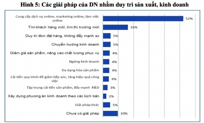 Một số doanh nghiệp cũng thực hiện đồng thời các giải pháp khác như chuyển hướng kinh doanh (5% số doanh nghiệp trả lời), giảm giá thành sản phẩm đi đôi với việc nâng cao chất lượng sản phẩm, đa dạng hóa sản phẩm, cải tiến quy trình tăng hiệu quả sản xuất (đều khoảng 4%).