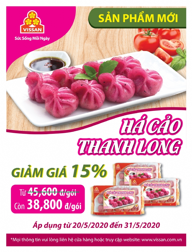 Nhằm mang đến cho khách hàng cơ hội dùng thử sản phẩm với mức giá ưu đãi hấp dẫn nhân dịp ra mắt, công ty Vissan triển khai chương trình giảm giá 15% sản phẩm Há cảo thanh long từ ngày 20/5/2020 đến hết ngày 31/5/2020. Chương trình được áp dụng khi mua hàng trực tiếp tại hệ thống cửa hàng giới thiệu sản phẩm Vissan, đặt hàng qua hotline 19001960, fanpage www.fb.com/CuaHangVissan hoặc mua online trên sàn thương mại điện tử SENDO và NOW.