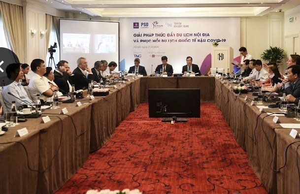 Các đại biểu tham dự cùng phân tích khảo sát của Google và khảo sát của TAB phối hợp cùng VnExpress. Phiên thảo luận xác định xu hướng du lịch của người Việt và những vấn đề đặt ra trong phục hồi du lịch sau giãn cách xã hội, để cân nhắc cách làm, đề xuất giải pháp thúc đẩy du lịch nội địa.