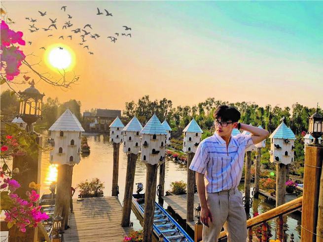 Nhất là khi hoàng hôn buông xuống ánh nắng hè không còn gay gắt chói chang thay vào đó là một màu hoài cổ. Mặt trời gom lại những tia nắng cuối cũng dần khuất sau triền núi, từng mảng trời Tây đỏ rực nhuộm hồng cả làn mây xốp trắng thêm vào đó một vài cánh chim chiều chao liệng khiến người ta ngỡ lạc vào thế giới trữ tình của tạo hóa, mãi mê khám phá quên cả lối về. Nếu bình mình với ánh sáng đẹp hoàn hảo thì chiều tà sẽ là khoảnh khắc “đắt trời cho” để có bộ ảnh tông màu hổ phách với “background” độc lạ như bến tàu, chuỗi lâu dài bồ câu, Vạn lý trường cầu, cặp nhà trống - mái, sân ngắm chim trời, khóm hoa nổi đa sắc màu… Nàng tiên Trà sư khép mi hững hờ khi ánh dương dần tàn để lại bao luyến lưu trong lòng, du khách mượn ý thơ để bộc bạch tâm tình: