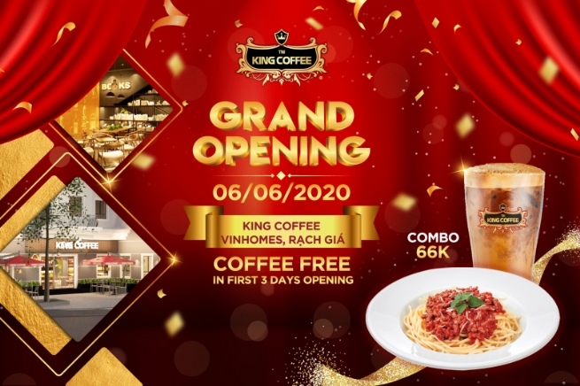 Nhân dịp khai trương, King Coffee triển khai nhiều chương trình khuyến mãi hấp dẫn dành cho khách hàng: từ ngày 06/06/2020 đến hết ngày 08/06/2020, khi ghé đến trải nghiệm sản phẩm và dịch vụ tại cửa hàng King Coffee (Vinhomes, Rạch Giá), quý khách hàng sẽ được miễn phí 01 ly cà phê King Coffee vị tùy chọn: cà phê Espresso đậm vị cá tính đặc biệt cho các thanh niên trẻ, Latte Vanilla ngọt ngào quyến rũ dành riêng cho phái đẹp hay cà phê sữa đá truyền thống đúng phong cách Việt Nam.