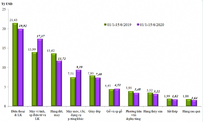 Về xuất khẩu, tổng kim ngạch xuất khẩu của Việt Nam trong kỳ 1 tháng 6/2020 đạt 10,37 tỷ USD, giảm 5,3% so với 15 ngày cuối tháng 5/2020. Tính từ đầu năm đến hết ngày 15/6/2020, kim ngạch xuất khẩu của cả nước đạt 110,56 tỷ USD, giảm nhẹ 0,7% so với cùng kỳ năm 2019.