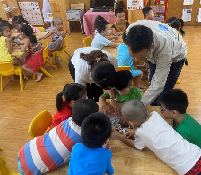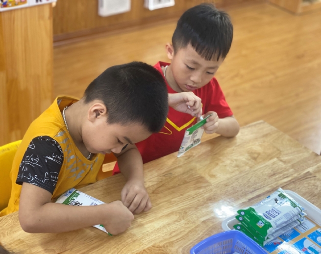 Sau một thời gian thực hành liên tục, các em đã hình thành thói quen tự gấp vỏ hộp sữa sau khi uống và để vào nơi thu gom mà không cần sự giám sát của các cô