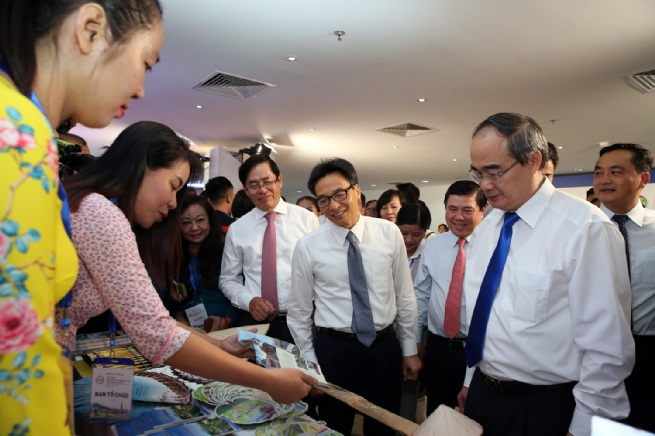 Bí thư Thành ủy TPHCM Nguyễn Thiện Nhân, Phó Thủ tướng Vũ Đức Đam thăm một gian hàng giới thiệu du lịch vùng Đông Nam Bộ. Ảnh: VGP/Mạnh Hùng