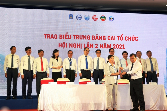 Lãnh đạo tỉnh Tây Ninh trao biểu trưng đăng cai hội nghị lần 2 (năm 2021) cho lãnh đạo tỉnh Bình Phước. Ảnh: VGP/Mạnh Hùng