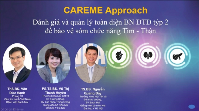 Đó là nội dung chính của chương trình Đào tạo y khoa liên tục trực tuyến “CAREME - Gặp gỡ chuyên gia” số thứ hai với chủ đề “Đánh giá và quản lý toàn diện bệnh nhân Đái tháo đường týp 2 để bảo vệ sớm chức năng tim – thận” với sự tham gia của PGS. TS. BS. Vũ Thị Thanh Huyền, Trưởng khoa Nội tiết – Cơ xương khớp, BV Lão Khoa trung ương, Giảng viên Bộ môn Nội, Đại Học Y Hà Nội; TS. BS. Nguyễn Quang Bảy, Trưởng khoa Nội tiết – Đái tháo đường, BV Bạch Mai, Giảng viên Bộ môn Nội, Đại học Y Hà Nội; và ThS. BS. Văn Đức Hạnh, Phòng C1, Viện Tim Mạch Việt Nam, BV Bạch Mai.