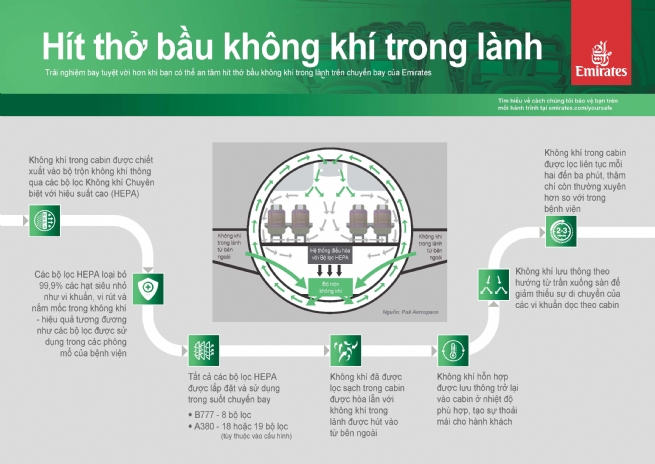 Hành khách của Emirates sẽ được tận hưởng sự thoải mái và an tâm trong không gian thông thoáng với bầu không khí trong lành. Mức độ thay đổi không khí trong khoang máy bay đã được chứng minh là tốt hơn so với các tòa nhà văn phòng cũng như tàu hỏa, và còn có thể so sánh với hệ thống được sử dụng trong các phòng mổ của bệnh viện. Không khí trong lành liên tục được bổ sung vào không khí đã được lọc thông qua các bộ lọc chuyên biệt (HEPA) để loại bỏ 99,997% tất cả bụi, vi rút, nấm mốc và vi khuẩn.