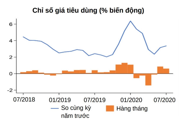 Doanh số bán lẻ hàng hóa và dịch vụ tiếp tục phục hồi với tốc độ tăng 4,6% (so cùng kỳ năm trước). Tốc độ tăng trưởng chế tạo chế biến và doanh số bán lẻ đều thấp hơn so với tháng 7/2019. Điều đó cho thấy nền kinh tế chưa thực sự phục hồi lại ở mức như trước khi có khủng hoảng.