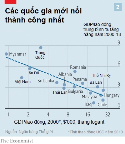 Bài viết của The Economist cũng cho biết, trong một cuốn sách mới mang tên “Năng suất toàn cầu: Xu hướng, động lực và chính sách”, Ngân hàng Thế giới (WB) đã sử dụng một thuật toán để sắp xếp nhiều khối liên minh các quốc gia, tìm kiếm các nhóm dường như sẽ hội tụ với nhau. Dựa trên năng suất của 97 nền kinh tế kể từ năm 2000, WB xác định 5 nhóm nước, trong đó có 3 nhóm “buồn nhất” rơi vào các nước khá nghèo, nhóm thứ tư gồm một số nền kinh lớn có tiềm năng như Argentina, Brazil, Indonesia, Mexico và Nam Phi.
